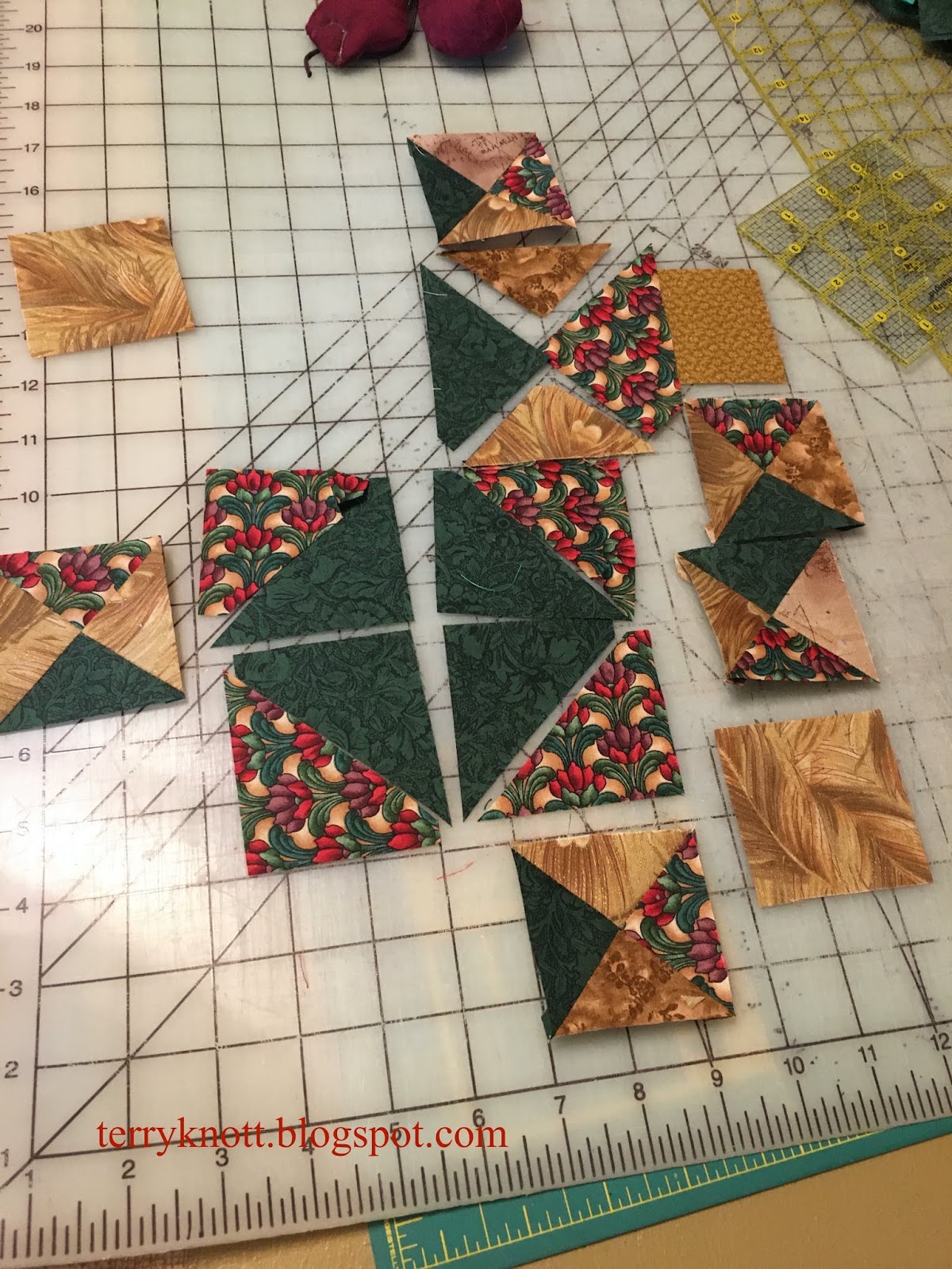 There wasn't enough of the neutral feather background fabric so I supplemented other scraps with the same value. After I had cut the two main fabrics, which were a green solid and a red print, I thought that I could sew at least two more if I added another neutral fabric, another backing and maybe another binding.