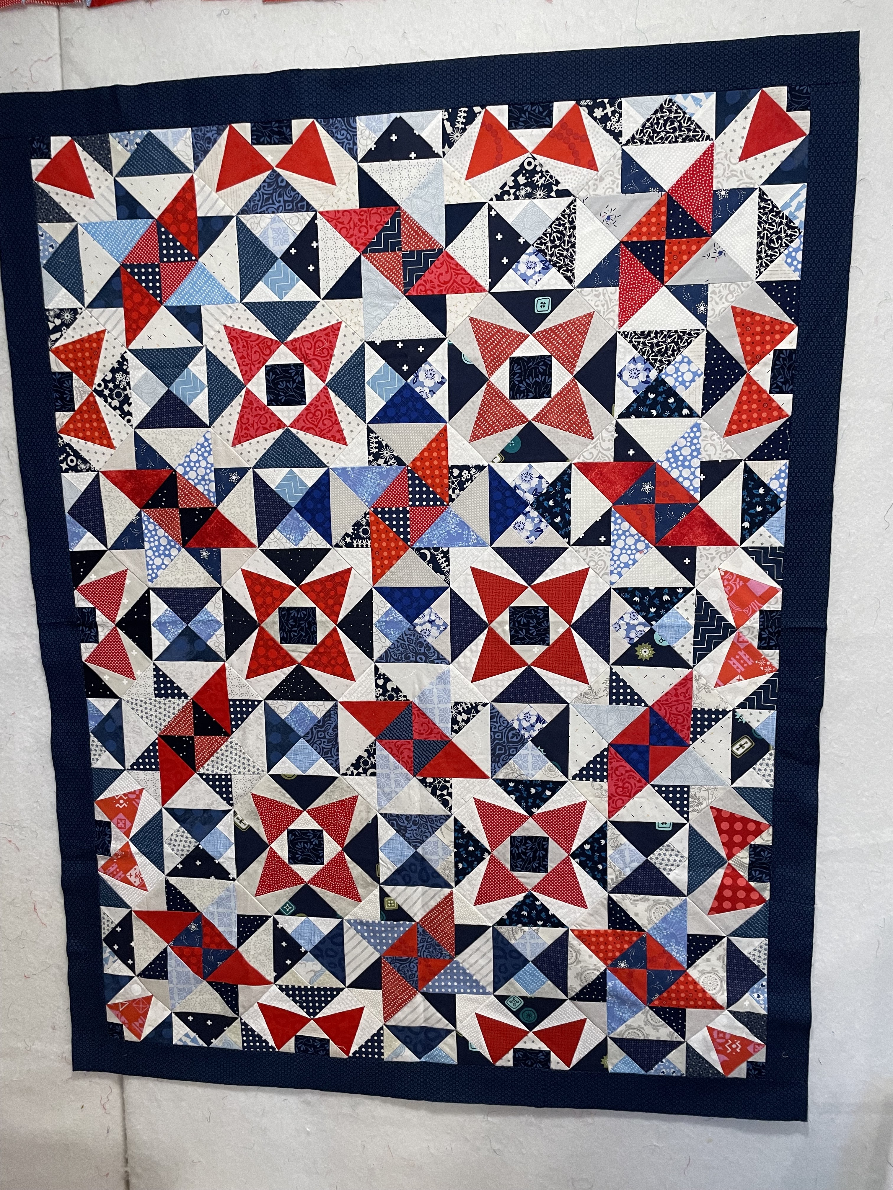 I used a leader/ender block I made during the process as the label. I estimate I used 3.75 yards of fabric from stash. To date, I've used four yards of fabric from stash. Total fabric purchased since my February fabric ban is 16 yards. I need to continue with the finishes to be able to count the fabric I've been using from my stash! This project finished at 37 inches wide by 34 inches high.